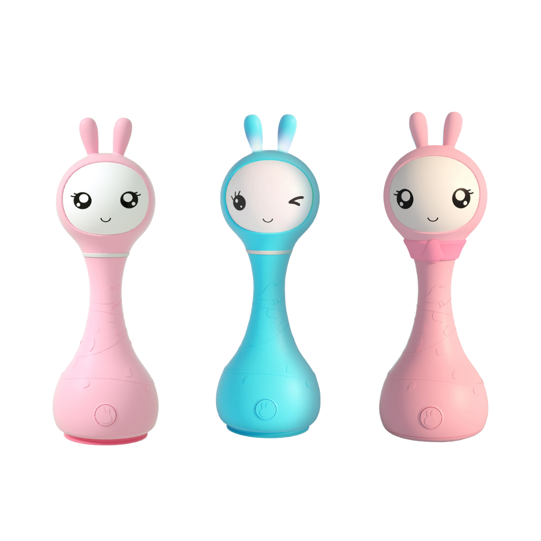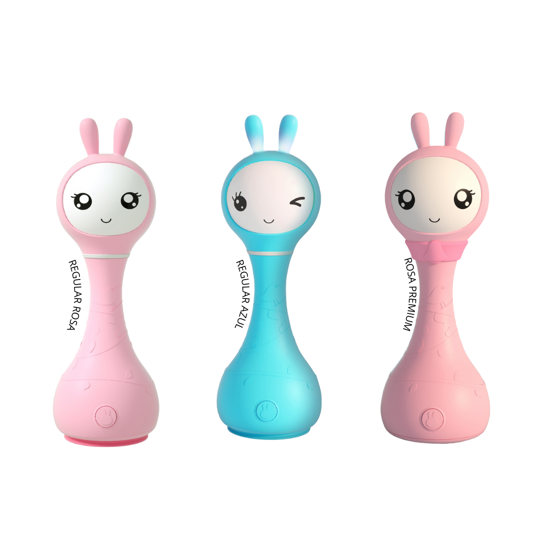 Esta increible sonaja digital e inteligente está diseñada para los niños y niñas desde 0 años en adelante y no solo apara la etapa de cuna, sino que promete ser el juguete ideal para largos años ya que incluye canciones y cuentos, además de que al agitarla reproduce sonidos estimulantes y sensoriales. Equipada con un lector de tarjetas las cules permite identificar diferentes colores, las orejitas de éste grandioso conejito funcionan como mordederas ideales para esos primeros años de infancia además de brillar en la obscuridad. No dejes pasar ésta grandiosa oportunidad y permite a tus hijos tener un maestro de inglés desde los 0 meses ya que se encuentra equipado con canciones y tarjetas por lo que ellos pueden aprender ingles desde pequeños.