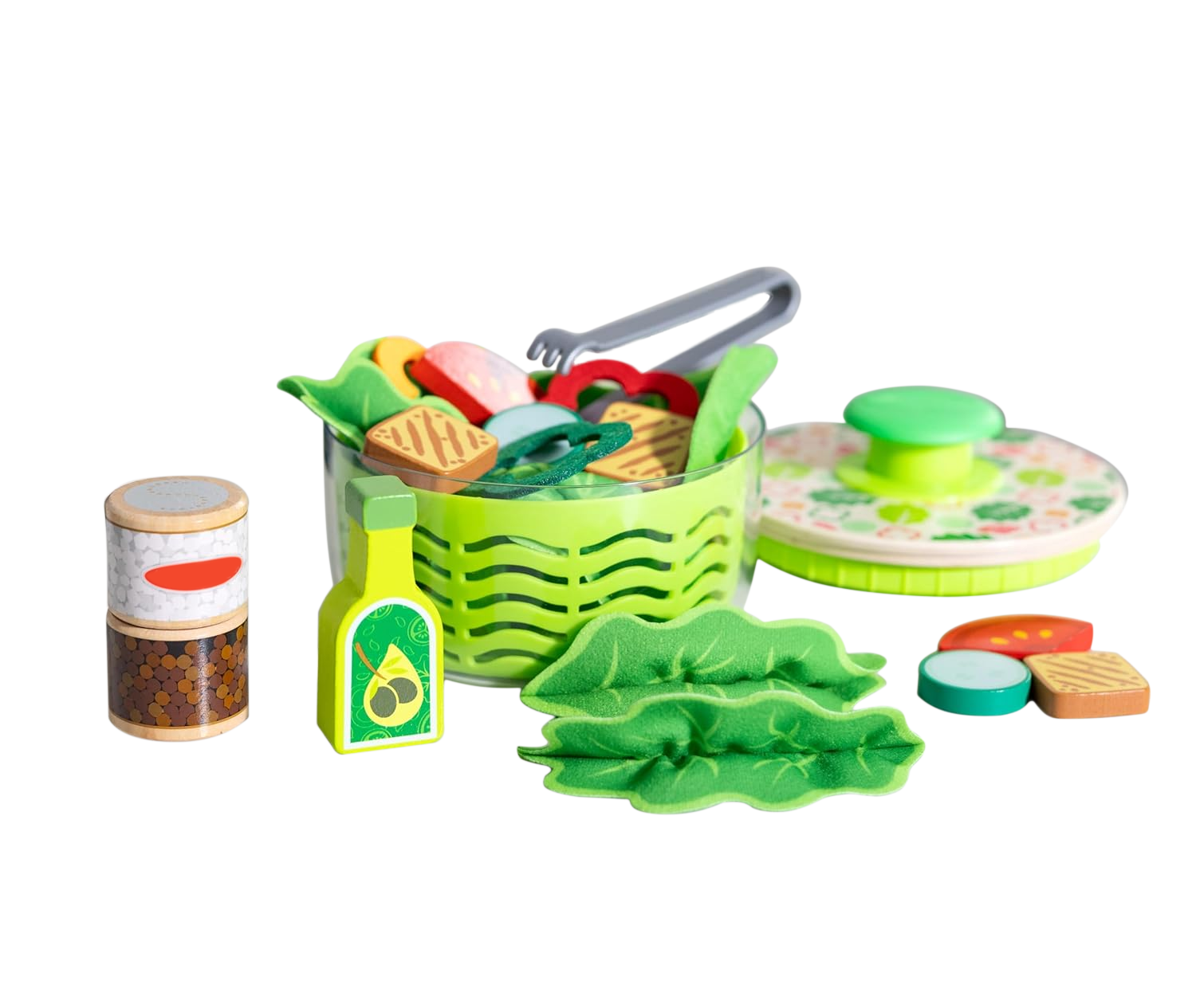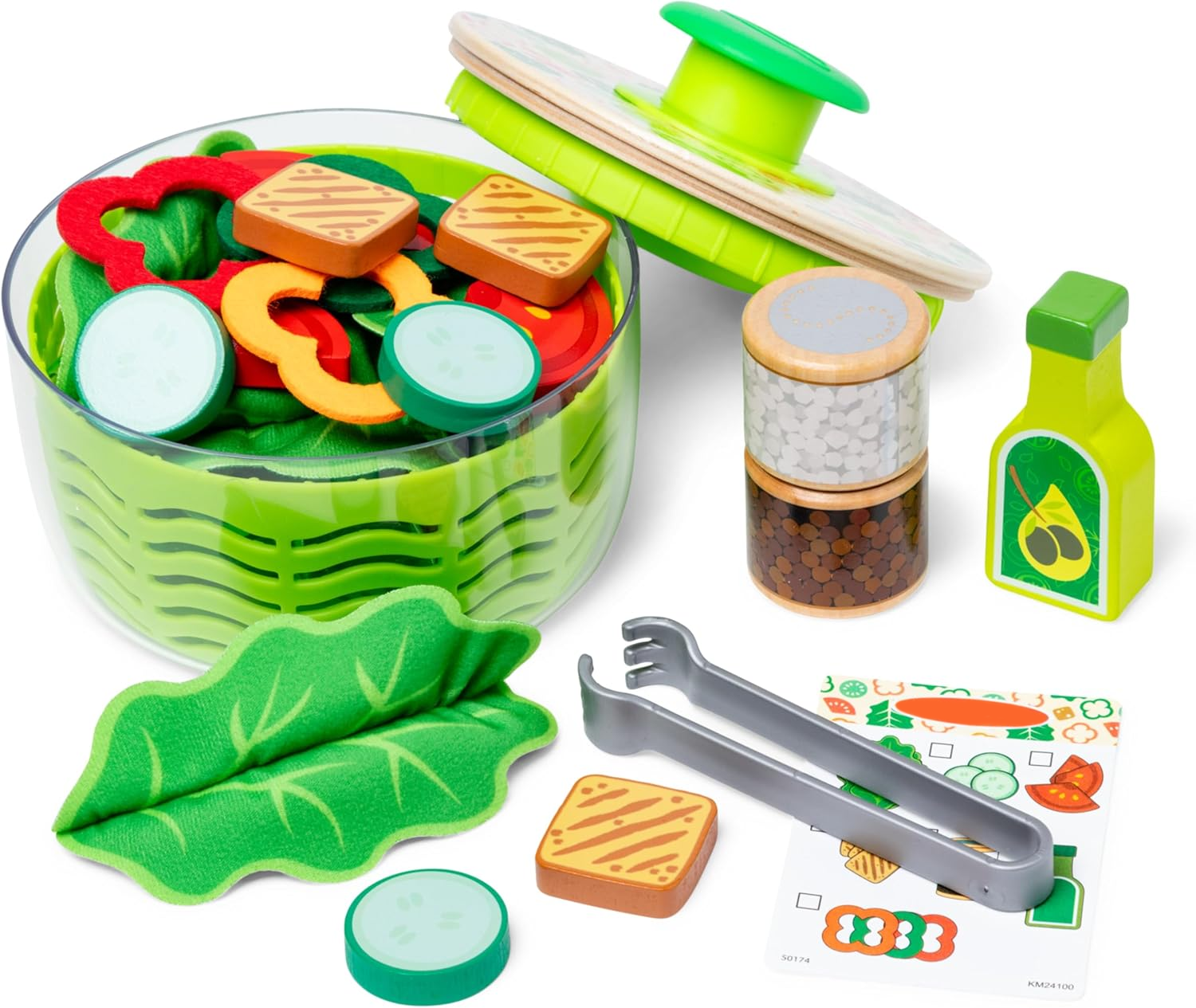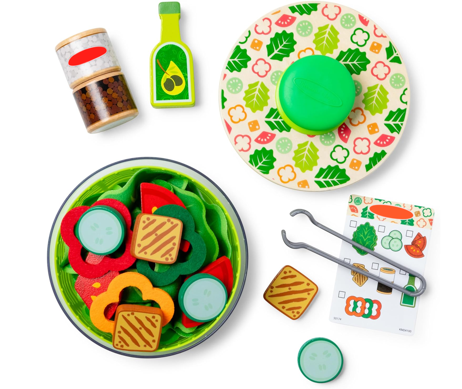 Incluye una bandeja giratoria, un recipiente de ensalada, una cabeza de lechuga de peluche con hojas de tela que se pueden pelar y volver a pegar, así como otros ingredientes de juguete como pimientos de fieltro, pepinillos de madera, tomates de madera, croutones de madera, una botella de aceite de oliva, y unas pinzas.
