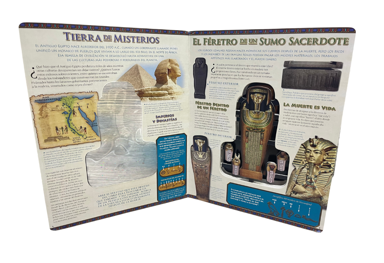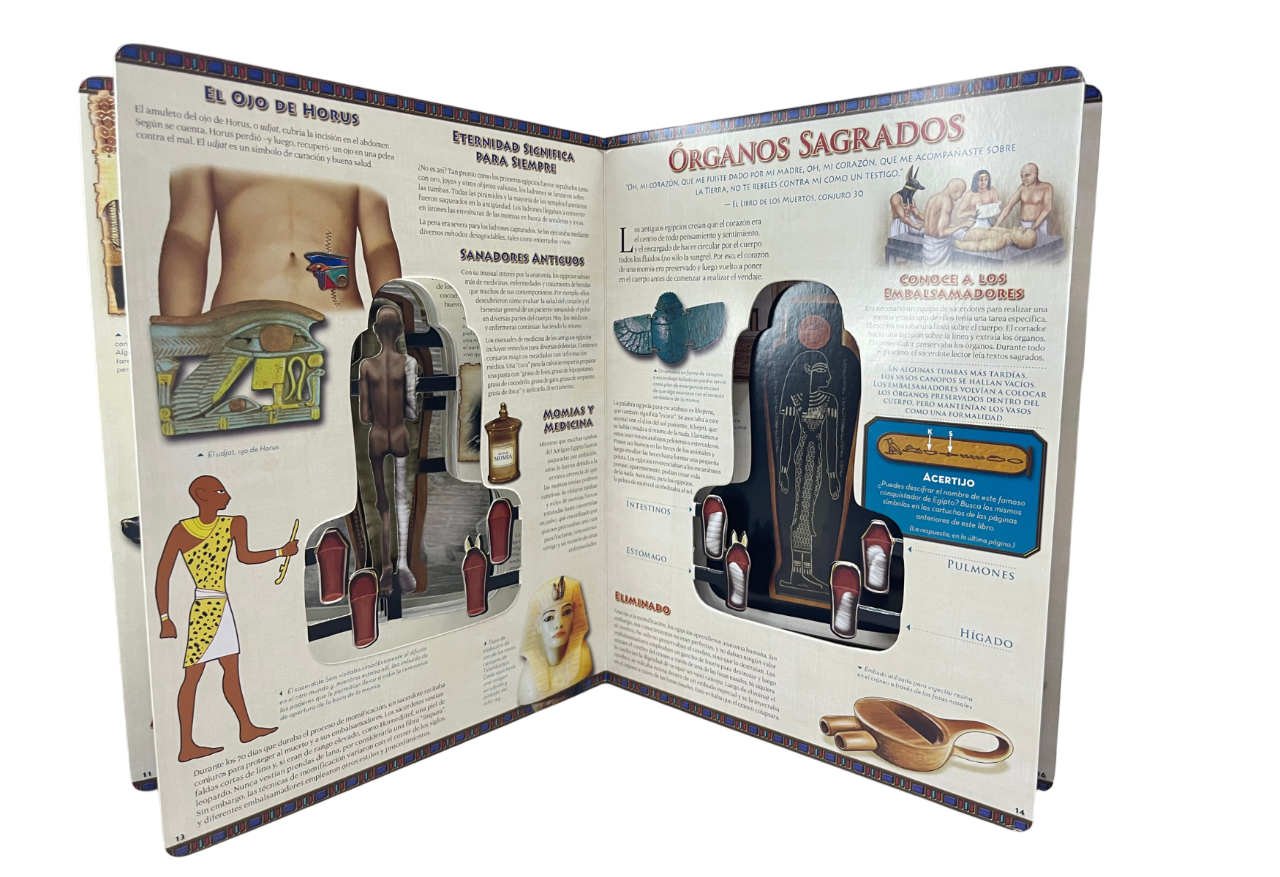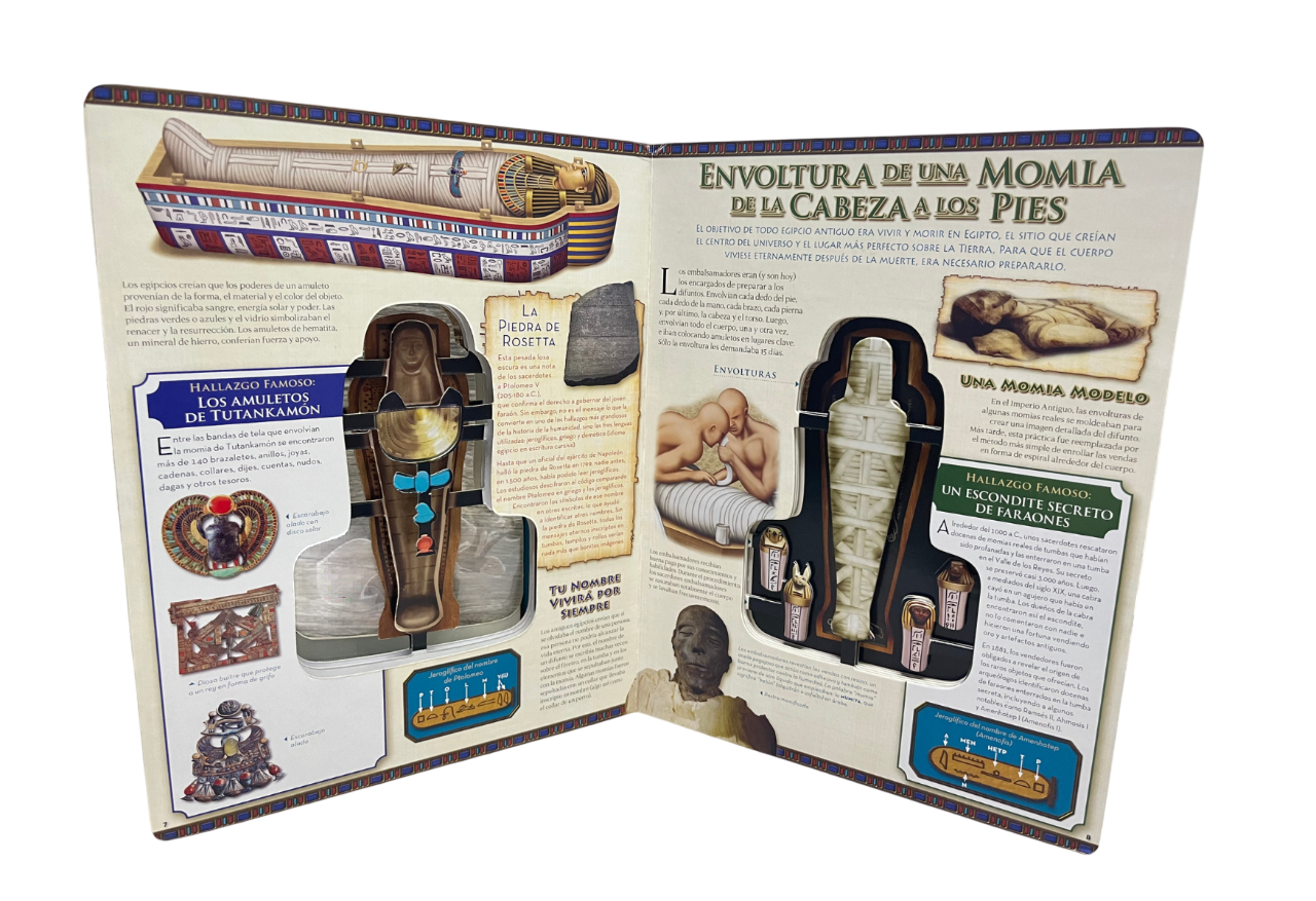 La propuesta del libro es única, ya que se presenta en forma de una especie de ventana al centro del libro visual en la que los lectores pueden observar los diferentes elementos y detalles que forman parte de una momia. A través de ilustraciones detalladas y explicaciones simples pero precisas, los niños pueden aprender sobre los procesos de momificación, los objetos que se colocaban en las tumbas, las costumbres funerarias egipcias, y mucho más.
